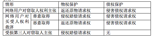 对第一种情形,物权保护主要通过返还原物,债权保护主要通过网络用户对窃取人的侵害债权请求权。