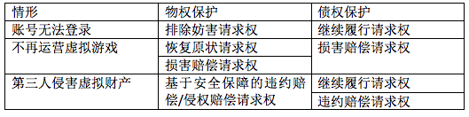 对于第三种情形,若网络用户对虚拟财产享有物权,则网络用户可以按照合同法第60条要求服务商承担保护其财产的安全保障义务,或者请求承担违约责任。另外,网络用户还可以请求服务商承担侵权法上的安全保障责任。如果基于债权保护,则用户只能向服务商要求履行“协助受领”的附随义务,或者在未履行情况下主张违约损害赔偿。