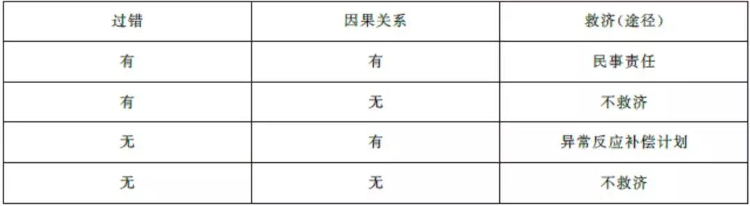 显然,如果两个体系的因果关系要件完全一致,那么首先,仅在损害后果与疫苗接种存在因果关系的情况下,受种者才能获得救济。其次,在存在过错的情况下,由民事责任体系救济受种方,在不存在过错的情况下,由异常反应补偿计划救济受种方。如此,在损害后果与疫苗接种有因果关系的情况下,受种方似乎得到了较为充分的救济。