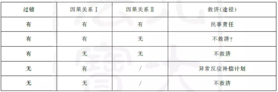 从上表可以清晰地看到,在有过错、有因果关系I而没有因果关系II的情形下,受种方可能在两个体系都无法得到救济。由于异常反应补偿计划以不存在过错为前提,所以在此种情形下不提供救济。而在民事责任体系中,由于过错与损害之间不存在因果关系,民事责任也无从成立。这样,受种方就将处于窘境。仍以某接种单位安排无接种资质的人员为受种者接种疫苗、后受种者发病为例,接种人员无资质,因而属于预防接种事故,被排除在异常反应补偿计划之外。但问题是,接种人员无资质与受种者的损害之间可能并不存在因果关系II,例如虽然其接种资格证过期,但是由于具备相关技术,只要申请续期,必定能获得许可,且在接种操作中没有任何失误,从而也被民事责任体系所排除。与此类似,就疫苗警示缺陷而言,美国学者也指出,由于国家对于学龄前儿童实行疫苗强制接种,因此即使警示不充分,也不能构成疫苗损害的近因。