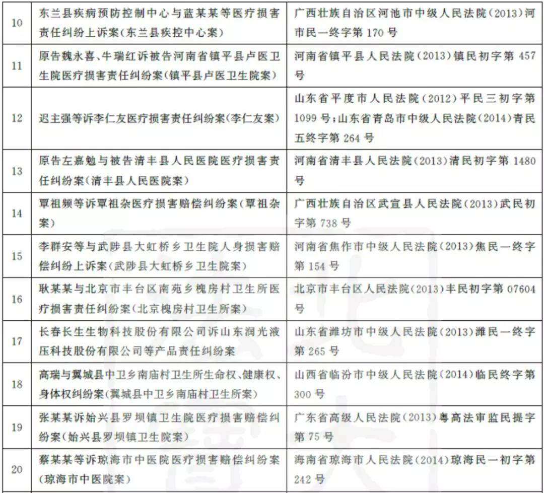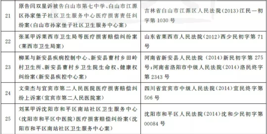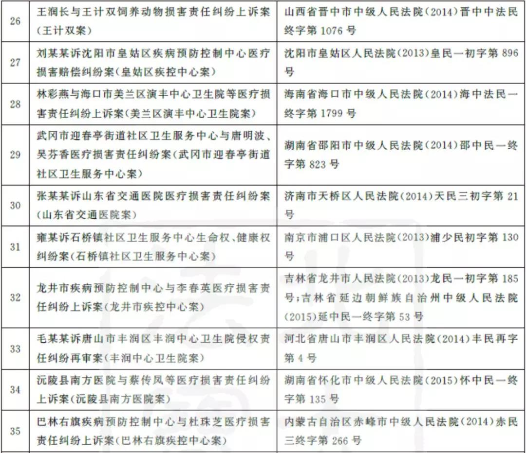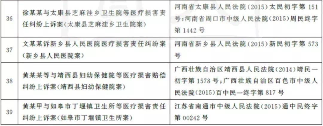 为了解我国疫苗接种损害救济双重体系运行的现状,笔者从两个维度展开实证分析。就疫苗接种损害民事责任而言,笔者于2016年7月12日在“北大法宝”案例数据库以“疫苗”为关键词进行全文检索,检索的时间范围为2012年1月1日至2016年5月31日,文书类别选定为“判决书”,案件类别选定为“民事纠纷”。经逐一鉴别,得到由疫苗接种引起的损害赔偿纠纷案件41例,排除2例二次赔偿案件,剩余39例作为相关典型案例。为便于论述,本文将39个典型案例依审结的时间顺序列表如下,以下再提及相关案例时,仅指明其中的接种单位(医疗机构或个人行医者)。