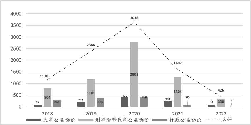 该数据以中国裁判文书网为基础,时间范围为2018年至2022年,地域范围为全国。从环境检察公益诉讼的总量上来看:2018年案件总量为1170件,2019年案件总量为2384件,2020年案件总量为3638件,2021年案件总量为1602件,2022年案件总量为426件。2018年民事公益诉讼案件97件、刑事附带民事公益诉讼案件804件、行政公益诉讼案件269件;2019年民事公益诉讼案件218件、刑事附带民事公益诉讼案件1811件、行政公益诉讼案件355件;2020年民事公益诉讼案件429件、刑事附带民事公益诉讼案件2801件、行政公益诉讼案件408件;2021年民事公益诉讼案件238件、刑事附带民事公益诉讼案件1304件、行政公益诉讼案件60件;2022年民事公益诉讼案件88件、刑事附带民事公益诉讼案件338件、行政公益诉讼案件0件。但是由于数据库的不完整以及其他客观原因,本文数据与真实数据可能存在些许出入,一切以官方公布的数据为准。