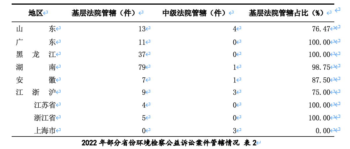 值得注意的是上海市所统计的3个案件均是由中级法院管辖的,观察表1,上海市的3个案件均系刑事附带民事公益诉讼,该3个案件由中级法院管辖,可能与刑事案件性质有关。