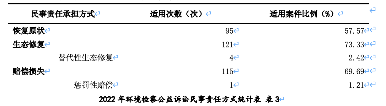 值得注意的是七件环境检察民事公益案件,该七件案件中均包含了赔偿损失,并有两件在赔偿损失的基础上要求恢复原状或生态修复。可见,赔偿损失是环境检察公益诉讼的主要承担方式,该情况应该会继续持续。