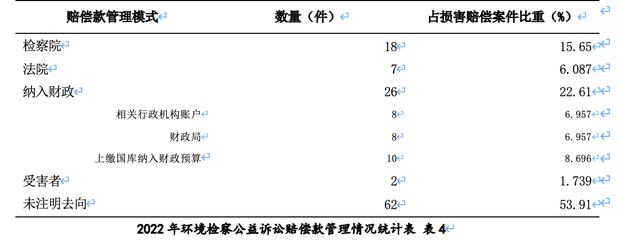 从数据上看,还有相当部分案件的赔偿金未注明管理方,占比53.91%。特别是还存在两例直接向受害者支付的情况。可见,环境检察公益诉讼赔偿款的管理方式并不明晰,导致实务中的管理模式较为分散,目前在环境检察公益诉讼中还未形成统一的赔偿金管理制度。