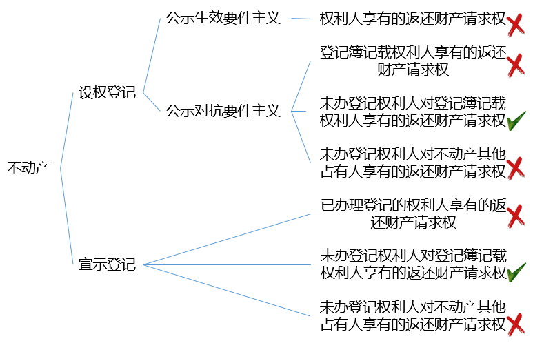 返还财产请求权中,先看以登记为公示方法的不动产物权,以设权登记为背景,就登记效力采公示成立(或生效)要件主义的不动产物权,如不动产所有权、建设用地使用权等,权利人享有的返还财产请求权不适用诉讼时效。因为只要登记簿上仍然显示不动产的权属状况,就会排除向不特定第三人呈现返还财产请求权不存在状态的可能。登记效力采公示对抗要件主义的不动产物权,如土地承包经营权、地役权等,登记簿上记载的权利人所享有的返还财产请求权不适用诉讼时效,理由同上;未办理登记就已经取得特定类型的不动产物权的权利人,其对登记簿记载权利人的返还财产请求权长期不行使,会对不特定第三人呈现出似乎在当事人之间不存在返还财产请求权的表现,有保护不特定第三人的必要,应适用诉讼时效;未办理登记就已经取得特定类型的不动产物权的权利人,其对非登记簿记载权利人的其他占有不动产的人享有的返还财产请求权,即使长期不行使,不会向不特定第三人呈现该不动产占有人没有返还财产请求权的状态,不存在保护不特定第三人信赖利益的必要,不适用诉讼时效制度。在宣示登记的背景下,若不动产物权人已经办理了宣示登记,其享有的返还财产请求权自然不存在适用诉讼时效制度的问题;在办理宣示登记之前,权利人对登记簿上记载的权利人享有的返还财产请求权长期不行使,即存在保护不特定第三人信赖利益的必要,应适用诉讼时效制度;办理宣示登记之前,权利人对登记簿上记载权利人外的不动产占有人享有的返还财产请求权,即使长期不行使,不会向不特定第三人呈现该不动产占有人没有返还财产请求权的状态,不存在保护不特定第三人信赖利益的必要,不适用诉讼时效制度。