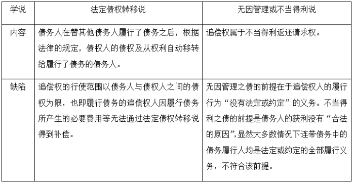 根据追偿权理论基础的不同,存在法定债权转移说和无因管理或不当得利说两种学说,主要区别如下: