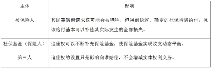 可见,社会保险基金追偿权的设置,实现了法律关系各方主体的利益在社会整体层面的均衡,社会保险基金正当性基础亦深植于此。