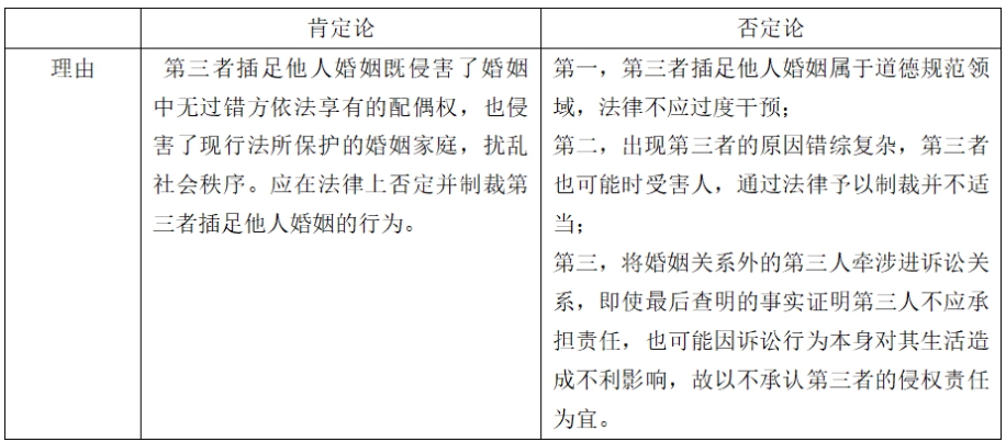 与违反婚姻忠实义务的婚姻过错方不同,婚外第三者并不必然因侵害婚姻中无过错方的合法权益而对其承担法律责任。婚外第三者与婚姻共同体及其内部的无过错方之间的合法权益,这与当事人之间的自由意志没有任何牵连。在我国当前的法律实践中,婚姻共同体的存在并不具备当然使婚外第三人知晓的特性,若由婚外第三者当然对婚姻中无过错方承担法律责任,则会对其本身应受法律保护的行为自由以及由此所体现的社会公共利益等产生不利影响。因此,需要通过利益权衡规则来确定相冲突的配偶权与行为自由等何者应优先保护。