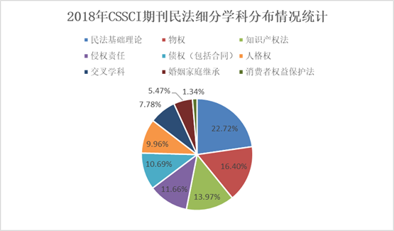 中国人民大学民商事法律科学研究中心对823篇民事法律科学论文进行细分学科分类统计,论文数量超过百篇的细分研究领域包括:其中以民法基础理论为研究领域的论文数量最多,达到187篇;以物权法为研究领域的论文135篇;以知识产权法为研究领域的论文115篇。此三部分研究领域论文数量总和,占民事法律科学论文总数近百分之六十(53.10%)。