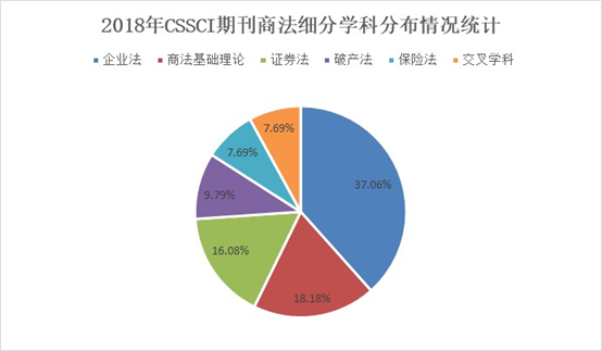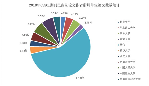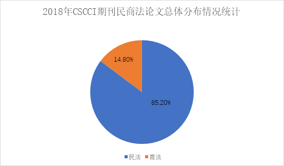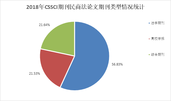 中国人民大学民商事法律科学研究中心对2018年民商事法律科学论文数据统计,是以中国社会科学研究中心2017—2018年公布CSSCI来源期刊包括:法学(23种)、综合性社科期刊(47种)、高校综合性学报(70种),共计140种期刊为范畴。2018年CSSCI来源期刊中共有117种期刊发表了民商事法律科学论文,其中法学(21种)CSSCI来源期刊发表民商事法律科学论文数量549篇,超过总量的一半;综合期刊发表209篇,高校学报发表208篇,均超过总数五分之一。
