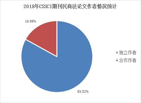 2018年在140种CSSCI来源期刊发表民商事法律科学论文966篇中,独立作者802篇,合作作者164篇,独立作者完成论文数量占总数量的绝对优势,合作作者不足五分之一数量。