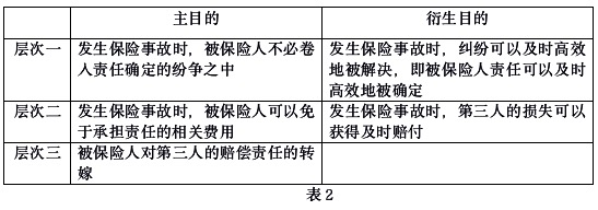 另一方面,责任保险具有两层合同目的:第一是合同主目的,即转嫁被保险人的责任风险;第二是衍生目的,即保证第三人获得保险金赔偿。且这两层目的又包含多个层次(如表2),但我国保险法及其解释四的相关规定仅满足主目的的层次二。实际上,责任保险制度应当将投保目的作为建构基础进行制度体系设置,既符合保险公司的商业理性及市场竞争需求,也有利于发挥保险人在争议解决方面的专业能力,从而提升纠纷解决与公共资源运用的效率。