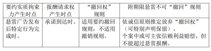悬赏广告亦可因被“撤回”而失效,“单方行为说”下,为维护相对人之信赖,悬赏广告之“撤回”属于例外的技术配置;依“合同说”之“意思实现说”,悬赏广告作为要约于发布时生效,则“撤回权”可对接要约生效后、被承诺前的撤销规则。应确保悬赏之不特定相对人可推知“撤回”之意思,或针对特定相对人作个别通知行使“撤回权”,“撤回权”亦可由悬赏人事先声明放弃。