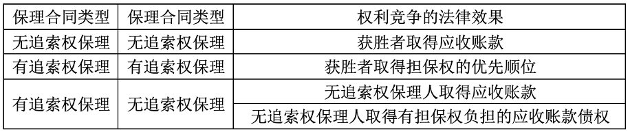 基于有追索权和无追索权两类保理,多个保理人之间的权利竞争根据保理合同的不同类型就存在三种情况,其法律效果参见下表。
