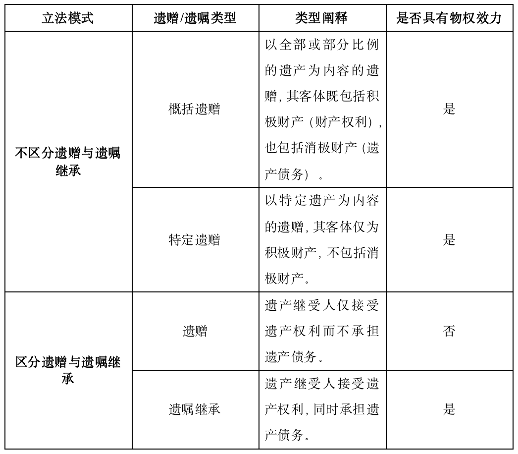 遗赠是否具有物权效力,与遗赠类型的选择有关。不同立法模式下不同遗赠类型对遗赠效力的影响如下。
