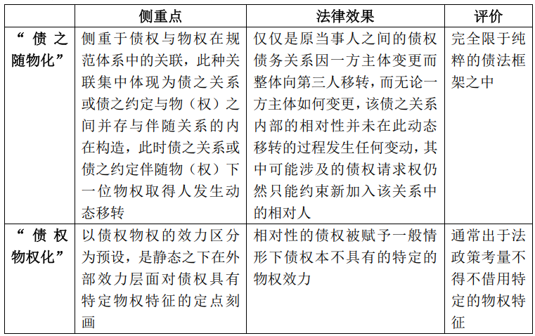 “债之随物化”与“债权物权化”的区别如下表所示。