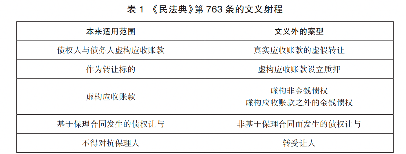 《民法典》第763条的文义射程较为狭窄,无法涵盖实践中存在的所有虚假转让债权的案型。首先,该条针对的是债权人与债务人虚构应收账款的情形,而未涉及债权人将真实的应收账款予以虚假转让的情况。其次,该条针对的是虚构应收账款进行转让,假如当事人虚构应收账款设立质押,则不在其文义范围之内。再次,该条将债权人与债务人虚构的对象限定为应收账款,这自然排除了虚构非金钱债权、应收账款之外的金钱债权予以转让的情形。复次,债权让与针对的系基于保理合同而发生的债权让与,非基于保理合同而发生的债权变动并不在该条的本来适用范围之内。最后,债权人与债务人虚构应收账款转让给保理人后,保理人再行转让该应收账款时,债务人能否对抗转受让人的问题,也不在其本来适用范围之内。(《民法典》第763条的文义射程请见表1)